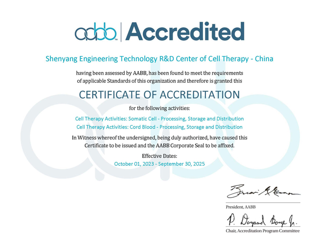 沈陽(yáng)細(xì)胞中心通過(guò)AABB雙認(rèn)證證書(shū)